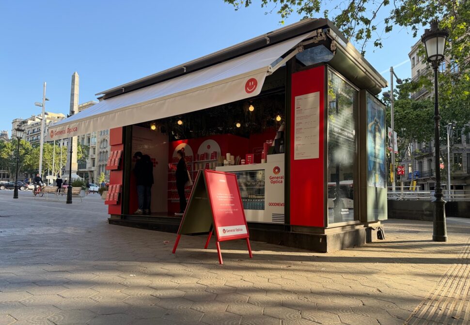 Quiosco ubicado en Passeig de Gràcia con Diagonal, en Barcelona, con el branding de General Óptica.